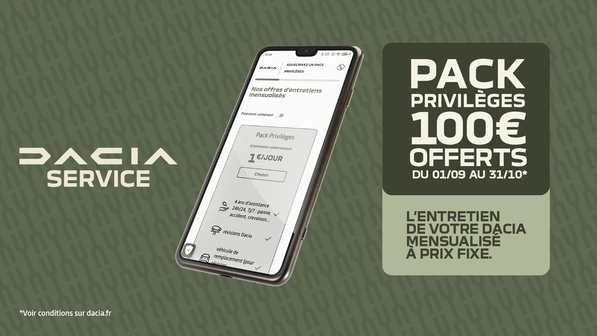 Du 01/09 au 31/10*, venez profiter de 100€ offerts pour la souscription au pack privilèges chez votre concessionnaire Dacia
